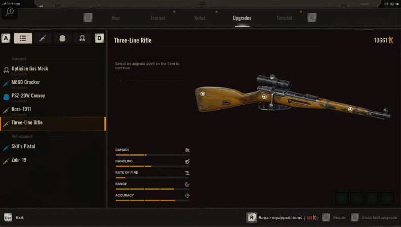 The Three-Line Rifle has extensive upgrade paths across stock, barrel, and body categories. Prioritizing upgrades that enhance accuracy, recoil control, and breath management is key to maximizing long-range lethality.