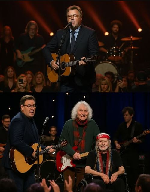 As Willie began to sing, his voice trembled with age but rang with truth. Every note carried decades of heartache, triumph, and the unbreakable spirit of country music. Vince Gill’s harmonies rose in reverence, weaving seamlessly around Willie’s lines.