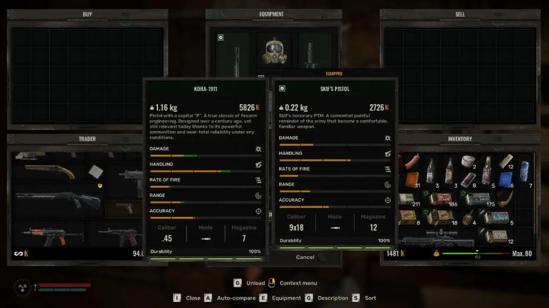 When traversing long distances or looting low-threat zones, equipping a lighter weapon like the Kora-1911 ensures maximum mobility and stamina retention, crucial for outrunning anomalies and sudden threats.